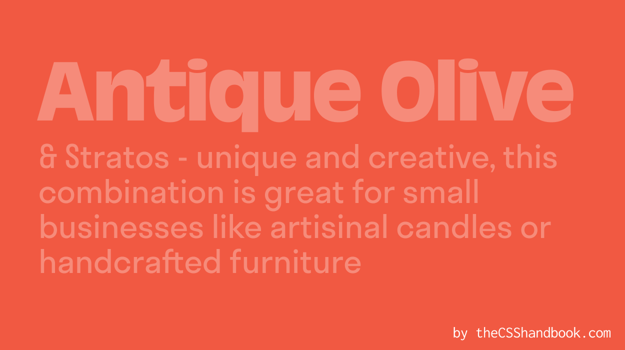 Antique Olive is the artisan of fonts - unique and creative. Creative or design-focused brands, this one’s for you. Pair it with Stratos for a dynamic look. It’s like a handcrafted piece of furniture in a modern apartment!