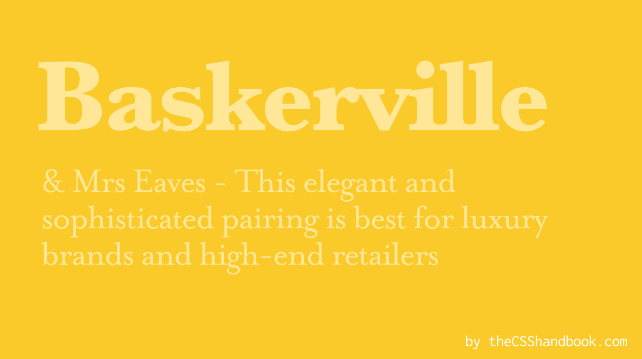 Baskerville is as refined and elegant as an aristocrat. Luxury or high-end brands will find it a perfect fit. Pair it with Mrs Eaves for a sophisticated look. Think expensive boutiques on Rodeo Drive!