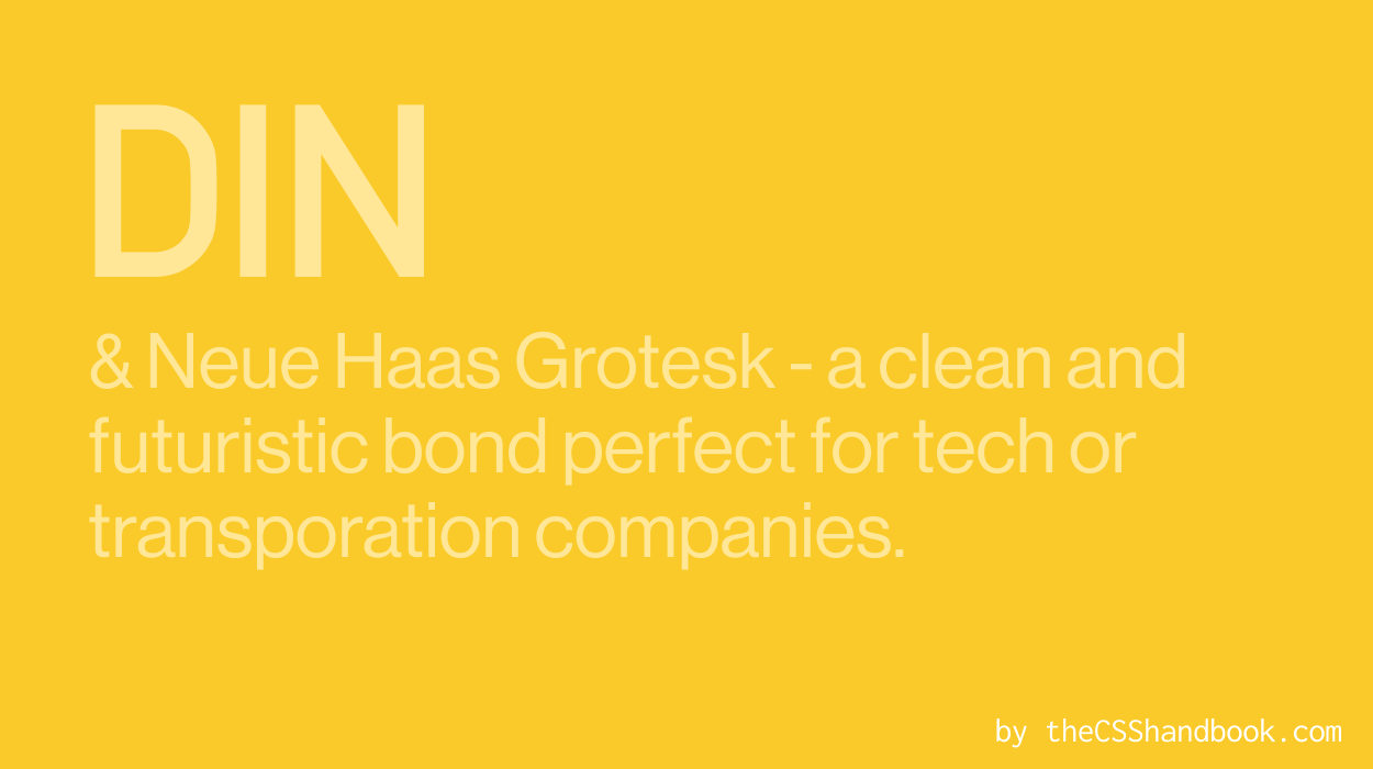 DIN is the tech guru of fonts - clean, geometric, and futuristic. It’s perfect for tech or transportation companies, giving off that innovative vibe. Pair it with Neue Haas Grotesk for a sleek, modern aesthetic.