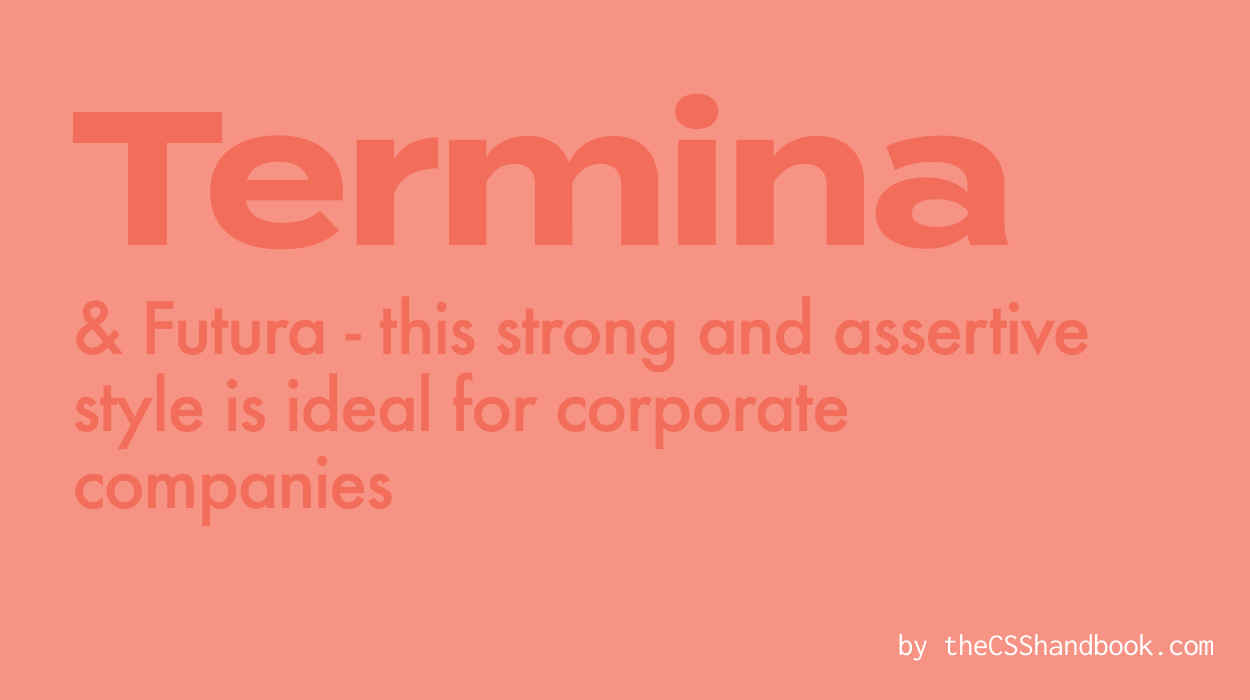 Termina is the powerhouse of fonts - strong and assertive. It’s perfect for brands with a strong, masculine aesthetic. Pair it with Futura for a balanced look. When using this pairing, think multinational corporations with towering offices.